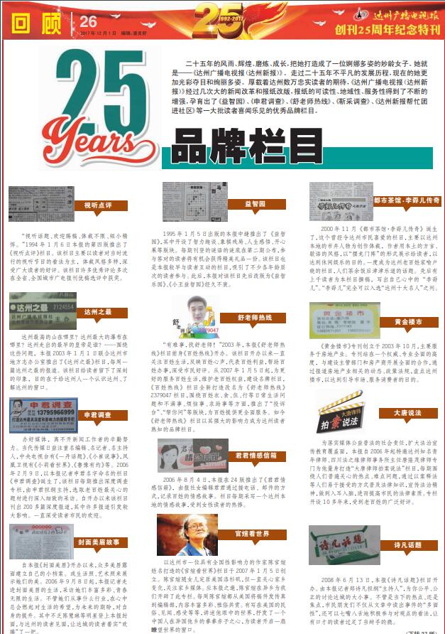 二十五年的風(fēng)雨、輝煌、磨煉、成長,把她打造成了一位婀娜多姿的妙齡女子。她就是——《達(dá)州廣播電視報(達(dá)州新報)》。走過二十五年不平凡的發(fā)展歷程,現(xiàn)在的她更加光彩奪目和絢麗多姿。厚載著達(dá)州數(shù)萬忠實讀者的期待,《達(dá)州廣播電視報(達(dá)州新報)》經(jīng)過幾次大的新聞改革和報紙改版,報紙的可讀性、地域性、服務(wù)性得到了不斷的增強,孕育出了《詩凡話題》等一大批讀者喜聞樂見的優(yōu)秀品牌欄目。